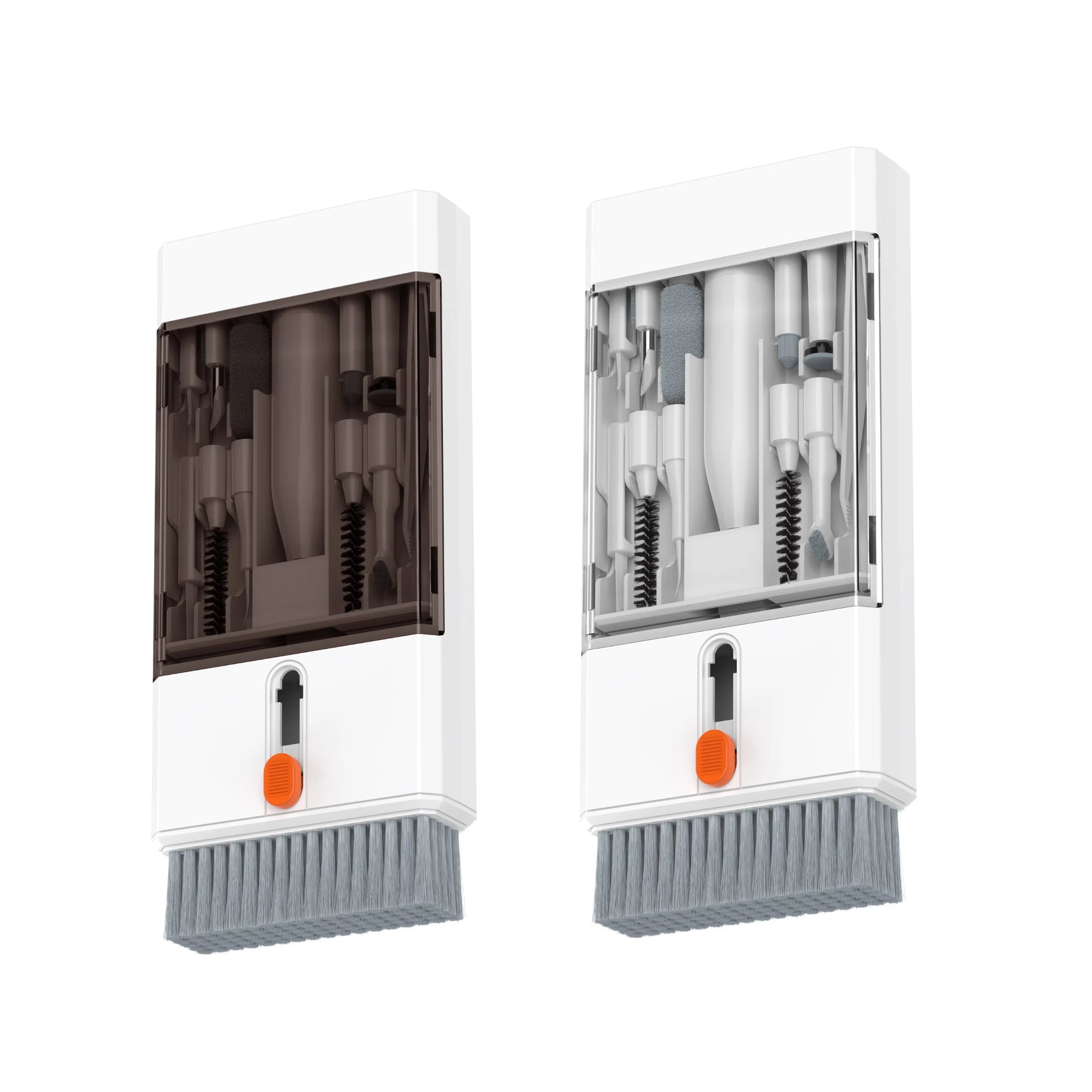 22-in-1 cleaning kit accessories display, featuring various brushes, cleaning tools, and storage for electronic devices.