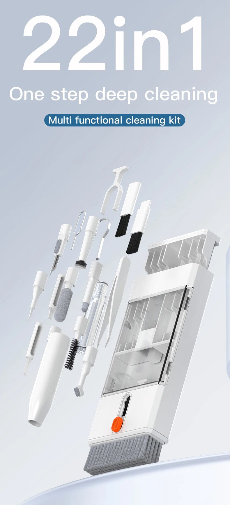 22-in-1 multi-function cleaning kit for deep cleaning iPhone, AirPods, iPad, PC, and more with various cleaning tools.