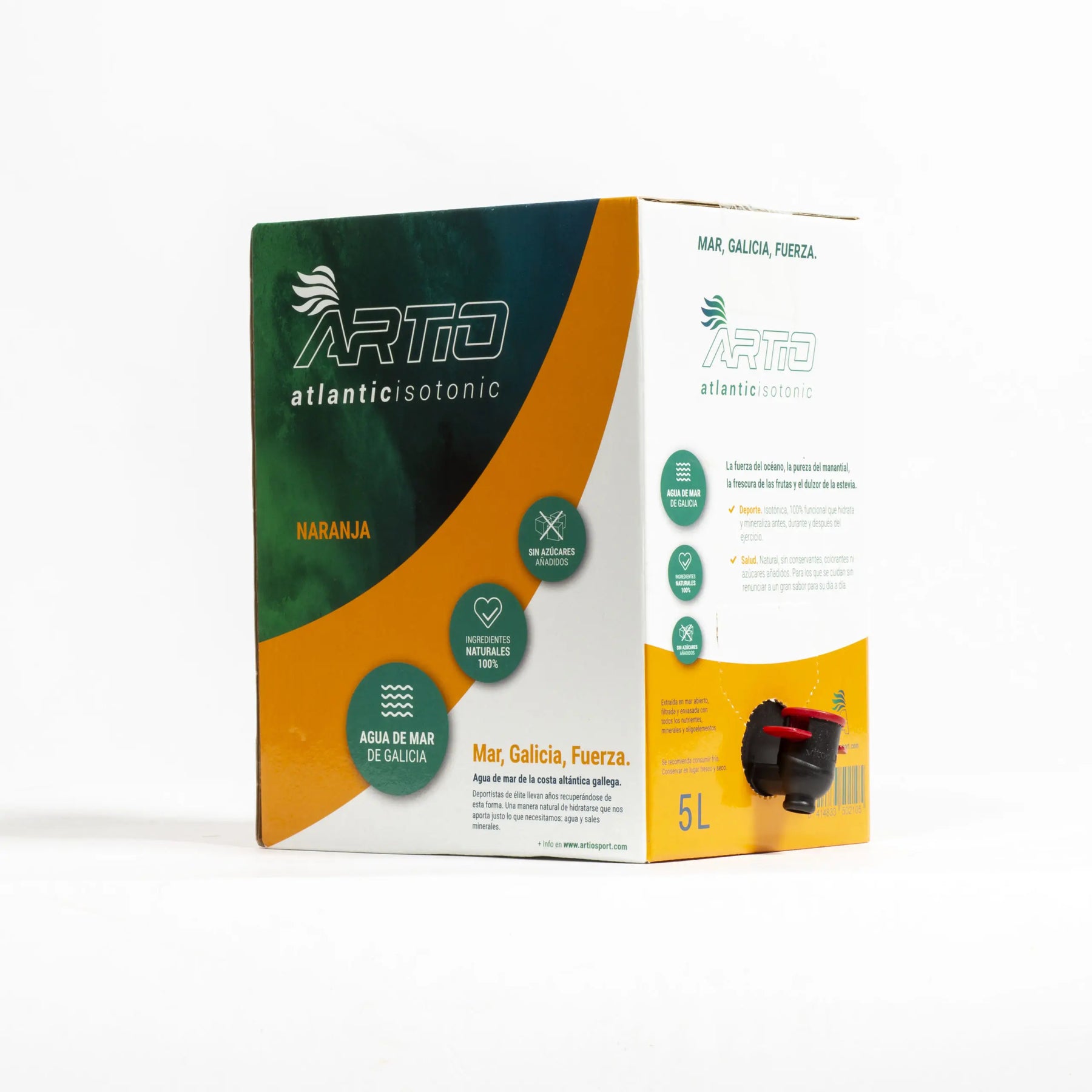 Artio sport isotonic drink in 5L box, orange flavor, 100% natural ingredients, sugar-free, suitable for vegan and keto diets.