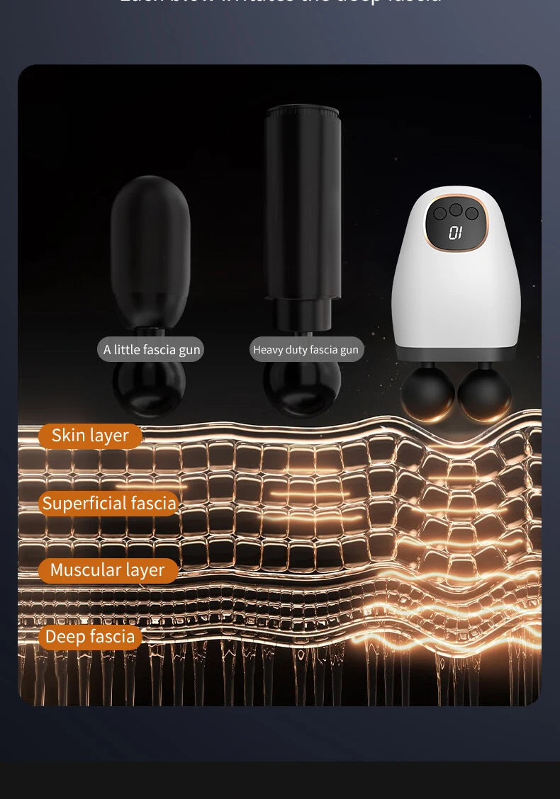 Comparison of fascia guns: a little fascia gun, heavy-duty fascia gun, and their applications on skin and muscular layers.